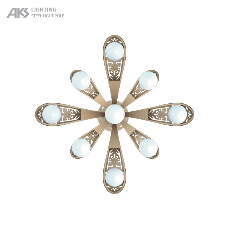 The cross-section of the vertical pole can be polygonal (equilateral octagonal, unequal octagonal, twelve-sided) or cylindrical, or it can be molded as required with special-shaped cold-drawn rods, 6-8m high and 5-12mm wall thickness.