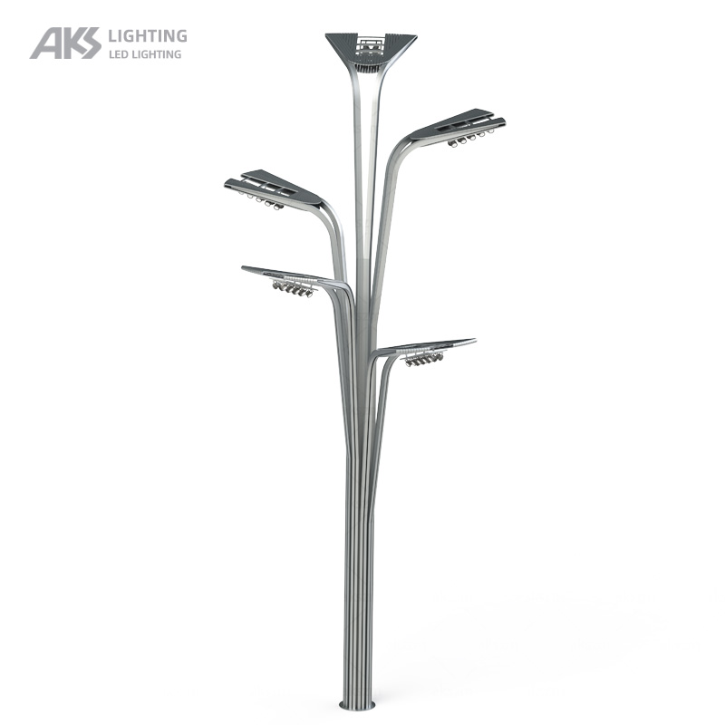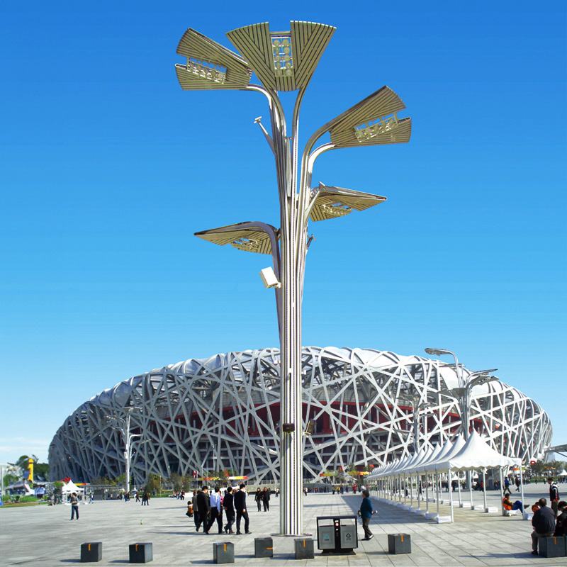 The cross-section of the vertical pole can be polygonal (equilateral octagonal, unequal octagonal, twelve-sided) or cylindrical, or it can be molded as required with special-shaped cold-drawn rods, 6-8m high and 5-12mm wall thickness.